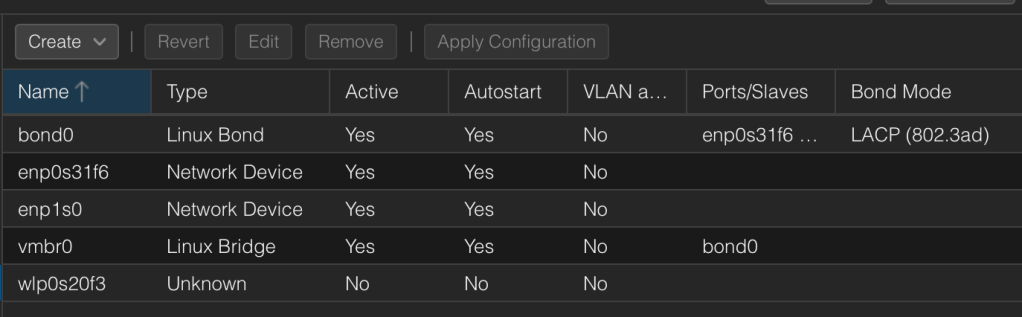 From the menu select create --> Linux Bond. Within Slaves enter both of your NIC details - my example was enp0s31f6 enp1s0. Note there is a space between them. I selected LACP (802.3ad) within the Mode dropdown. To finish click create.